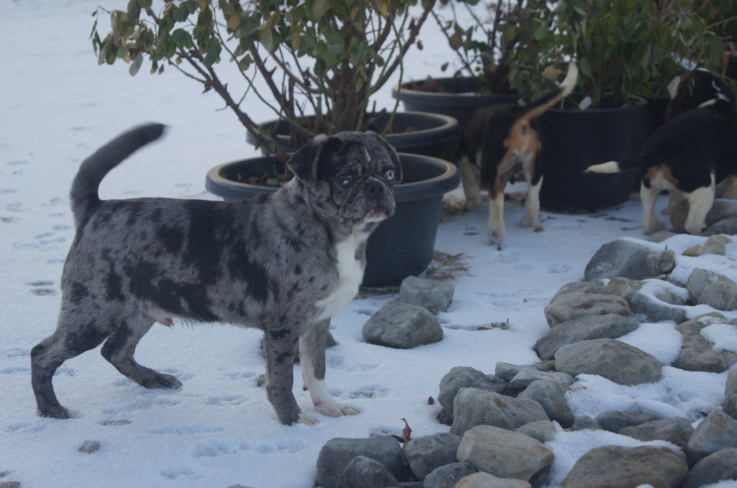 BLUE our youngest stud he has a very unique look with his one blue eye . He throws beautiful pups. Around 15 to 18 pounds